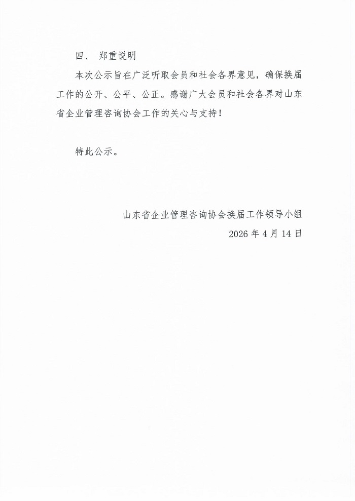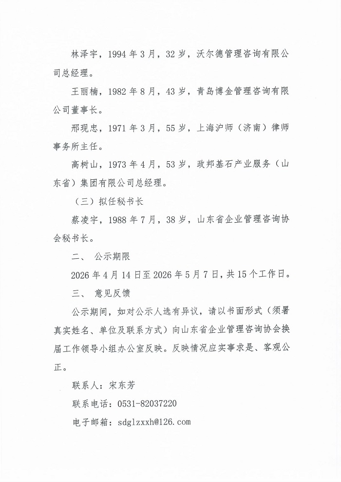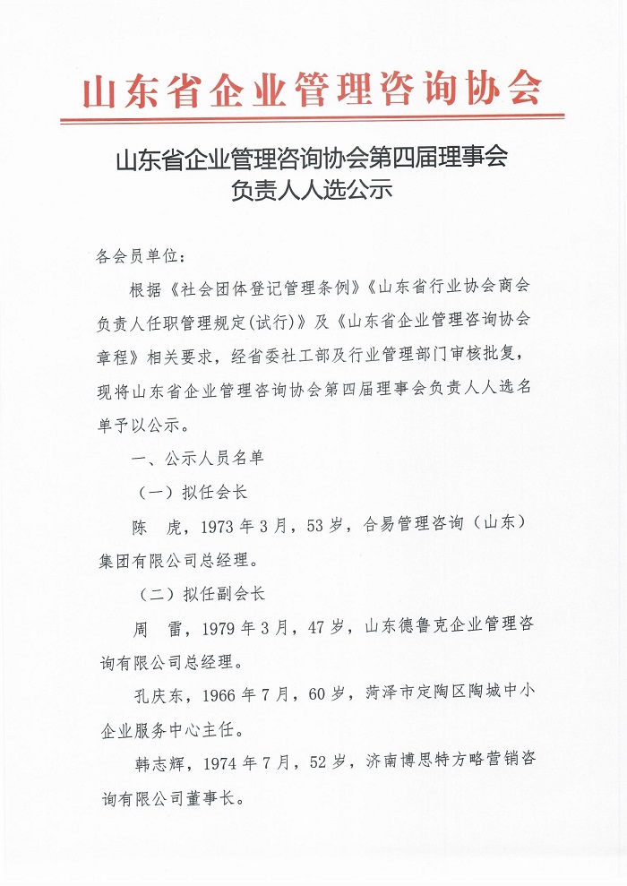 山东省企业管理咨询协会第四届理事会负责人人选公示