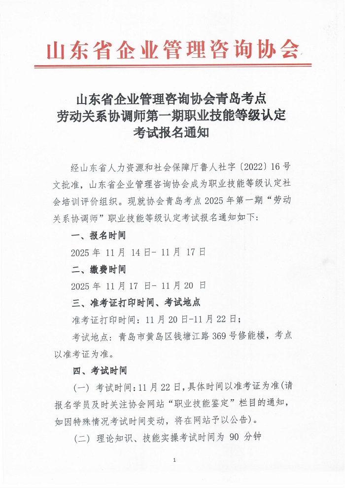 山东省企业管理咨询协会青岛考点劳动关系协调师第一期职业技能等级认定考试报名通知